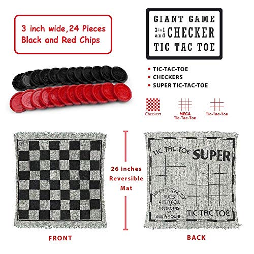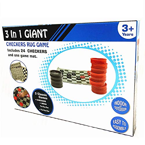 ★ 3 in 1 Jumbo Checker Rug Game: Three classic game. Two Players. One Great Time! Includes Checkers, Tic Tac Toe, and MEGA Tic Tac Toe.