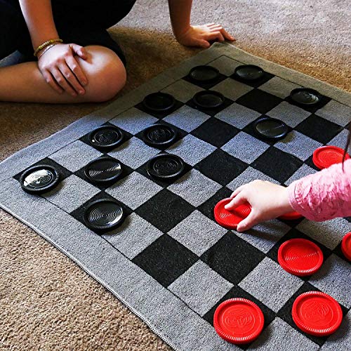 ★ Reversible Rug: The soft, woven rug measures 26″ x 26″ and features a checker board on one side, tic tac toe at the other. Including: 24 giant checkers about 3” wide, 12 pieces red and 12 pieces black.The large size makes them secure for all ages, children and adults!