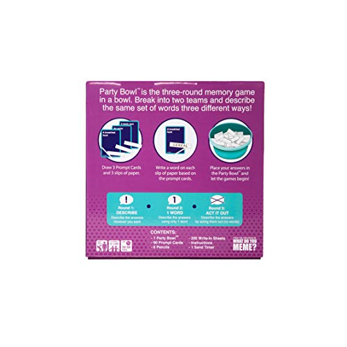 GET THE PARTY (BOWL) STARTED: 3 rounds, 2 teams, and 1 Party Bowl! In this instant classic, you use prompt cards to come up with a bunch of words or phrases to throw in the Party Bowl. Two teams then compete to out-guess each other in three increasingly high-pressure rounds of fun. Brought to you by the creators of What Do You Meme.