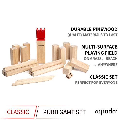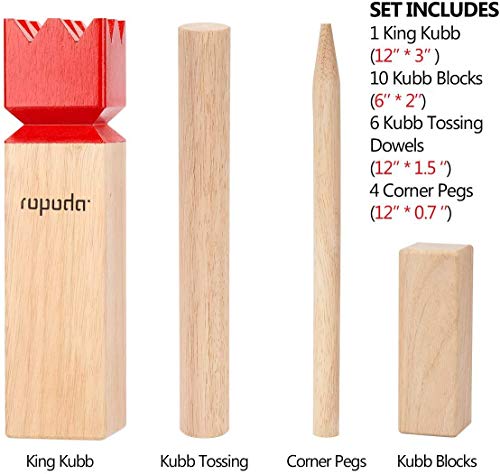 【EVERYTHING IS INCLUDED】 – ROPODA Backyard Kubb Set include everything you wish to have to play: 1 king, 10 kubbs blocks, 6 batons, 4 boundary sticks, 1 carrying bag, 1 rule book and 1 dry-erase scoreboard with pen. So the only thing you wish to have is having fun.