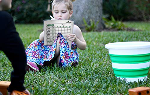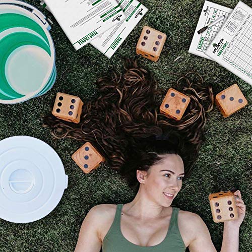 ✅ ALL-IN-ONE – All equipment included for Yardzee & Yard Farkle for up to 5 players. Includes 6 solid wood jumbo dice, 5 large reusable score cards, collapsible bucket, lid, & marker for a whole yard dice set.